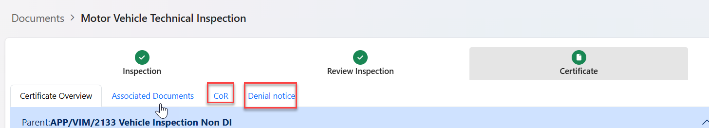 Upon successfully approving the inspection report, user will be landed on the page where the initiation of certificate of pass or fail will be done. See the figure below.