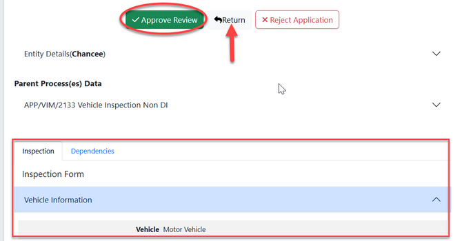 User will be landed on the page where the details of inspection will be shown on the tab"". Then will return if needs any improvement or approve if satisfied.