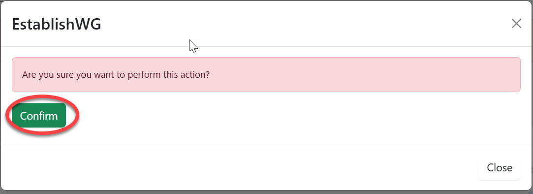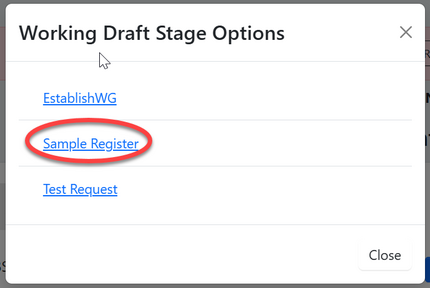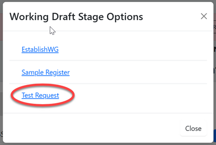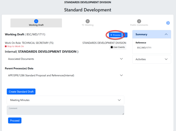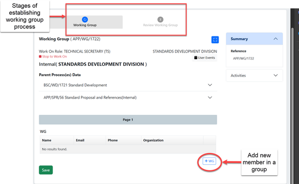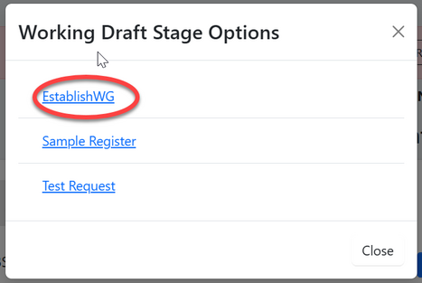 Upon clicking the "Process" user will see stages of working draft click on "Establish WG" to create a working group stage.