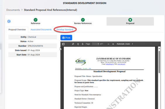 On the window appeared user can see the document summary of the proposal, tabs for overview, associated documents (if any) and develop standard. Click on the "Develop standard" tab.