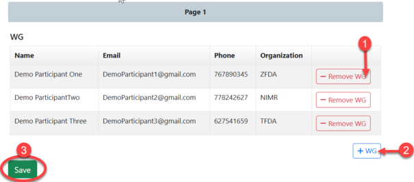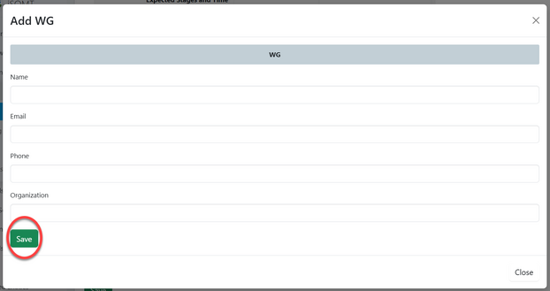 User will be re-routed to the window with the stages of establishing working group (see figure below). To add a new member click on "+WG" button.