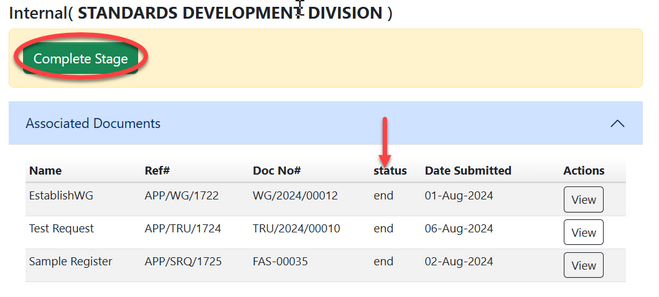 Upon completion of all activities in a working draft TS can complete stage by clicking