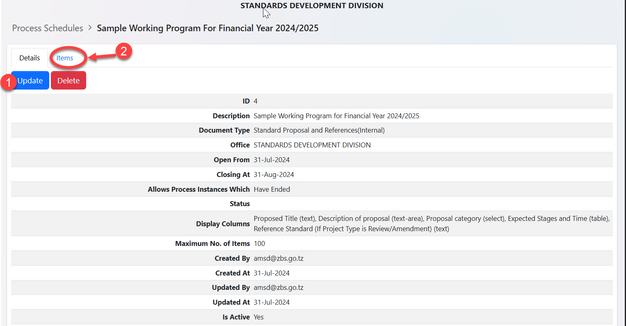 b) Adding Items (Proposals) - The options for updating and viewing items will appear as shown on the figure below.