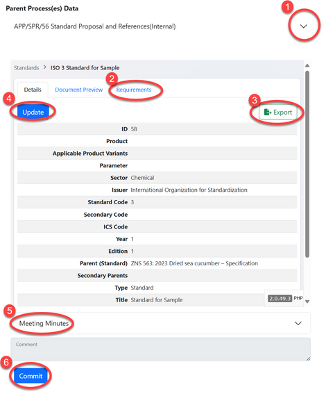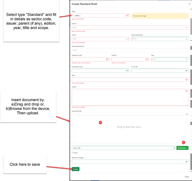 TS can create standard draft by filling in the prior standard details for development. Click on "Create Standard Draft" see the figure above on arrow point 1.
