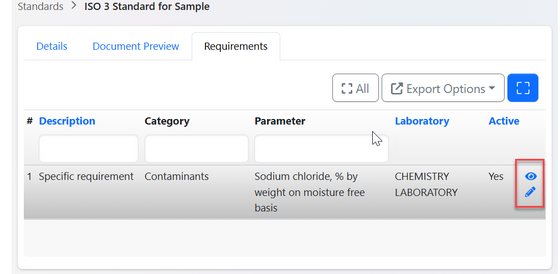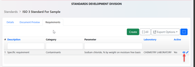 From the list of requirements, click on the intended one or click on "eye" like symbol as pointed on the arrow to view requirements details.
