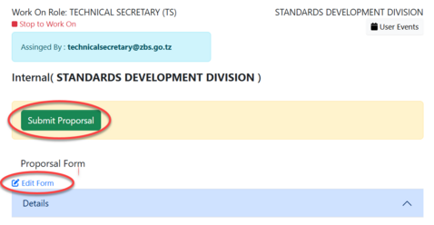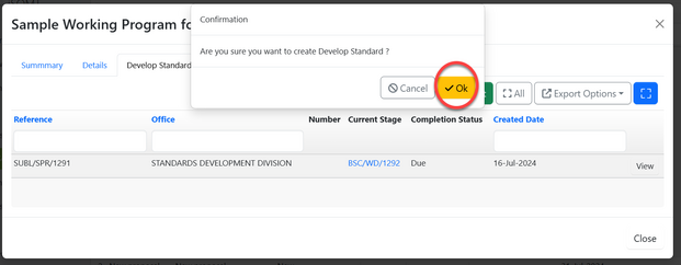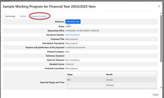 i - From working program click on the intended proposal to develop or click on the "eye" like symbol. The window below will open where user will click on "Develop Standard" (see figure )