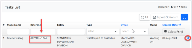 On the list task user will identify the intended request by searching a number of test request made in the working draft. See figure below. Then click on it or on "eye" like symbol to open.