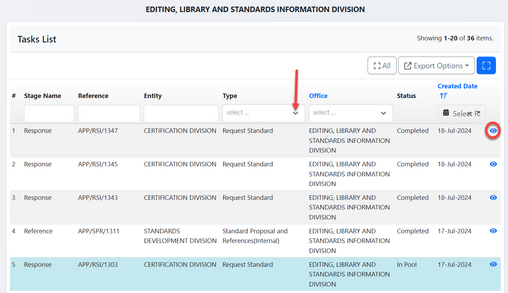 ii- From the list of task click the the intended proposal to develop or click on the "eye" like symbol.