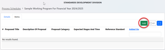 2) Item - Click on item to add and view items in the program, the items here refers standard proposals.